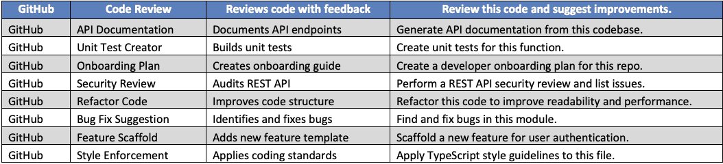 Copilot for GitHub supports developers by automating documentation, reviewing code, and enforcing standards. These prompts help streamline development and improve code quality.