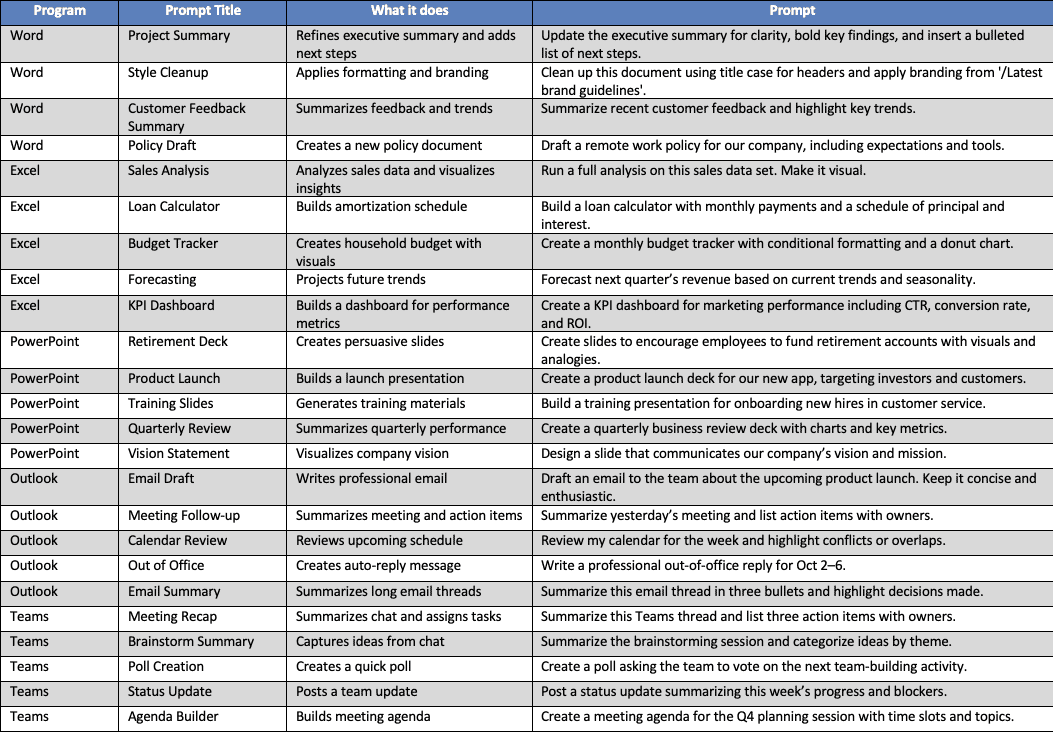 As this prompt library illustrates, Copilot is a powerful ally across departments and roles. But to unlock its full potential, training your team on effective prompt writing is essential. Consider hosting workshops, creating internal guides, or using this resource as a starting point to build prompt literacy across your organization.